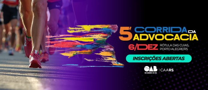 Estão abertas as inscrições para a quinta edição da Corrida da Advocacia Gaúcha. O evento, organizado pela CAARS em parceria com o Sesc/RS e patrocínio do Banrisul, ocorre no dia 6 de dezembro, na Rótula das Cuias (Avenida Edvaldo Pereira Paiva, 1503 — Porto Alegre). A concentração começa às 18h, a corrida infantil será a partir às 18h30 e a competição principal começa às 19h, com percursos de 3km, 5km e 10km de corrida; e 3km de caminhada. Para participar, inscreva-se em um dos links abaixo: