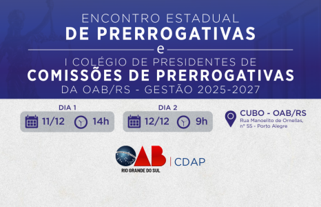 Comissão de Defesa, Assistência e Prerrogativas dos Advogados da OAB/RS realizará, nos dias 11 e 12 de dezembro, o Encontro Estadual de Prerrogativas e o l Colégio de Presidentes de Comissões de Prerrogativas da OAB/RS – Gestão 2025-2027As atividades ocorrerão de forma integrada, no Auditório OAB Cubo, com início às 13h30 na quinta-feira (11) e às 9h na sexta-feira (12).