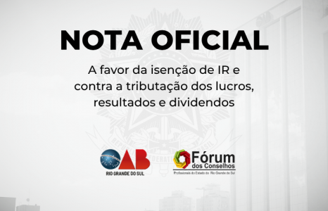 A Ordem dos Advogados do Brasil, Seccional do Rio Grande do Sul, e o Fórum dos Conselhos e Profissões Regulamentadas do RS, representando mais de um milhão de profissionais liberais no Estado, vêm a público manifestar sua absoluta contrariedade à tributação dos lucros, resultados e dividendos prevista nos Projetos de Lei nº 1.087/2025 e nº 1.952/2019.