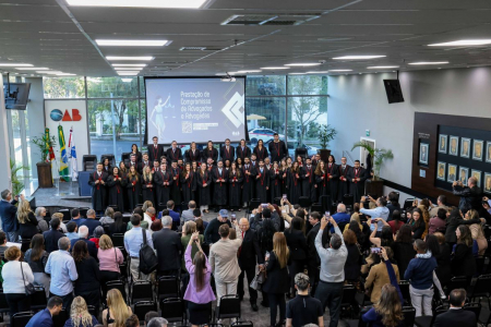 A OAB/RS realizou mais uma cerimônia de Prestação de Compromisso na quarta-feira (24), ocasião em que novas advogadas e advogados receberam suas credenciais profissionais e proclamaram o juramento da advocacia. O ato, conduzido pela diretoria da Ordem, marcou o início da trajetória profissional dos compromissandos e reafirmou os valores da ética e da cidadania que orientam a classe.