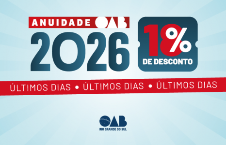 A OAB/RS reforça que estão nos últimos dias as condições especiais para pagamento da anuidade de 2026 em cota única com desconto ampliado de 18%. A modalidade, disponível até 30 de janeiro, permite o pagamento à vista ou em até três parcelas no cartão de crédito.